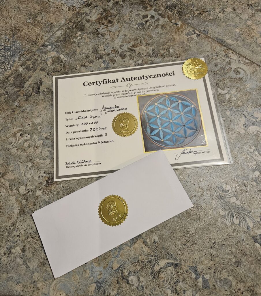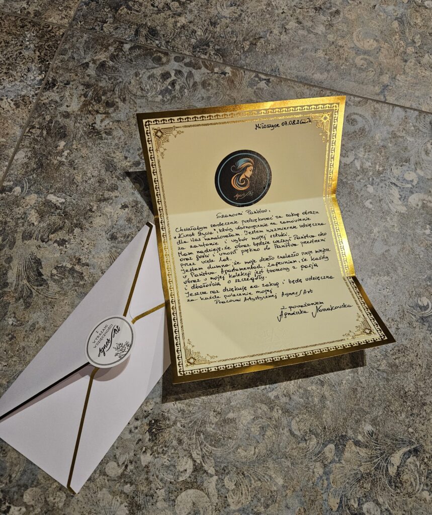 Do każdego obrazu dołączam certyfikat autentyczności oraz list z podziękowaniem za zaufanie i zakup mojej sztuki.