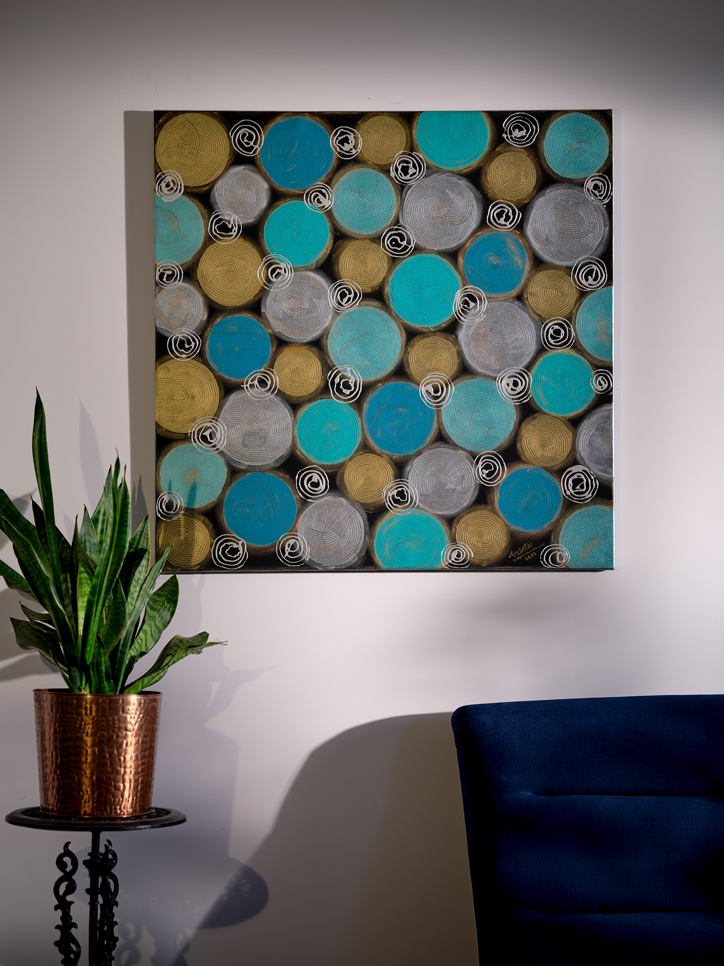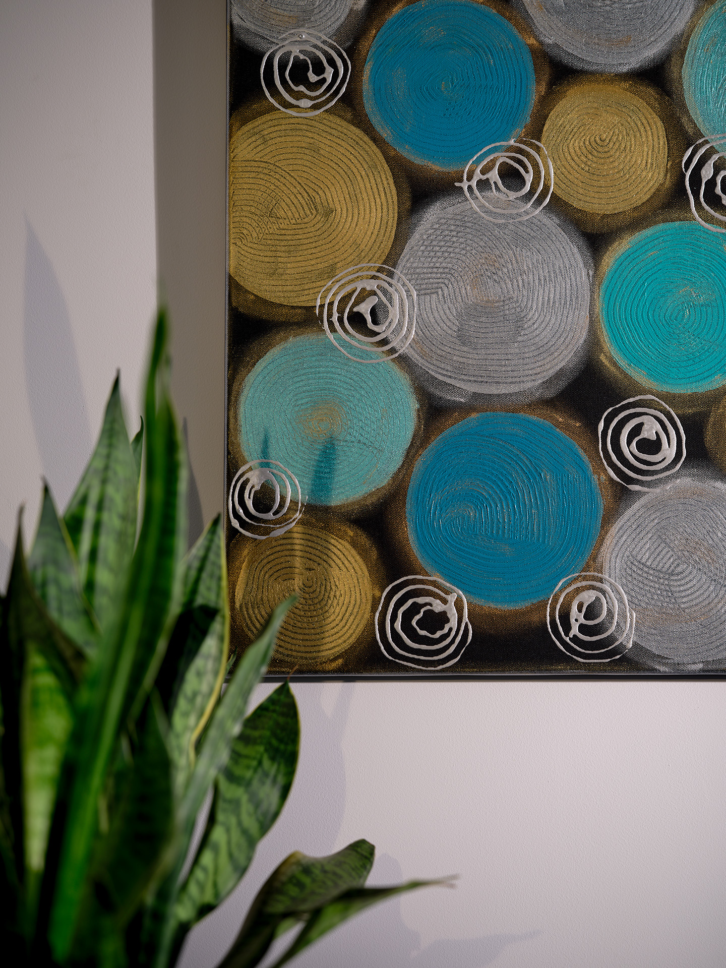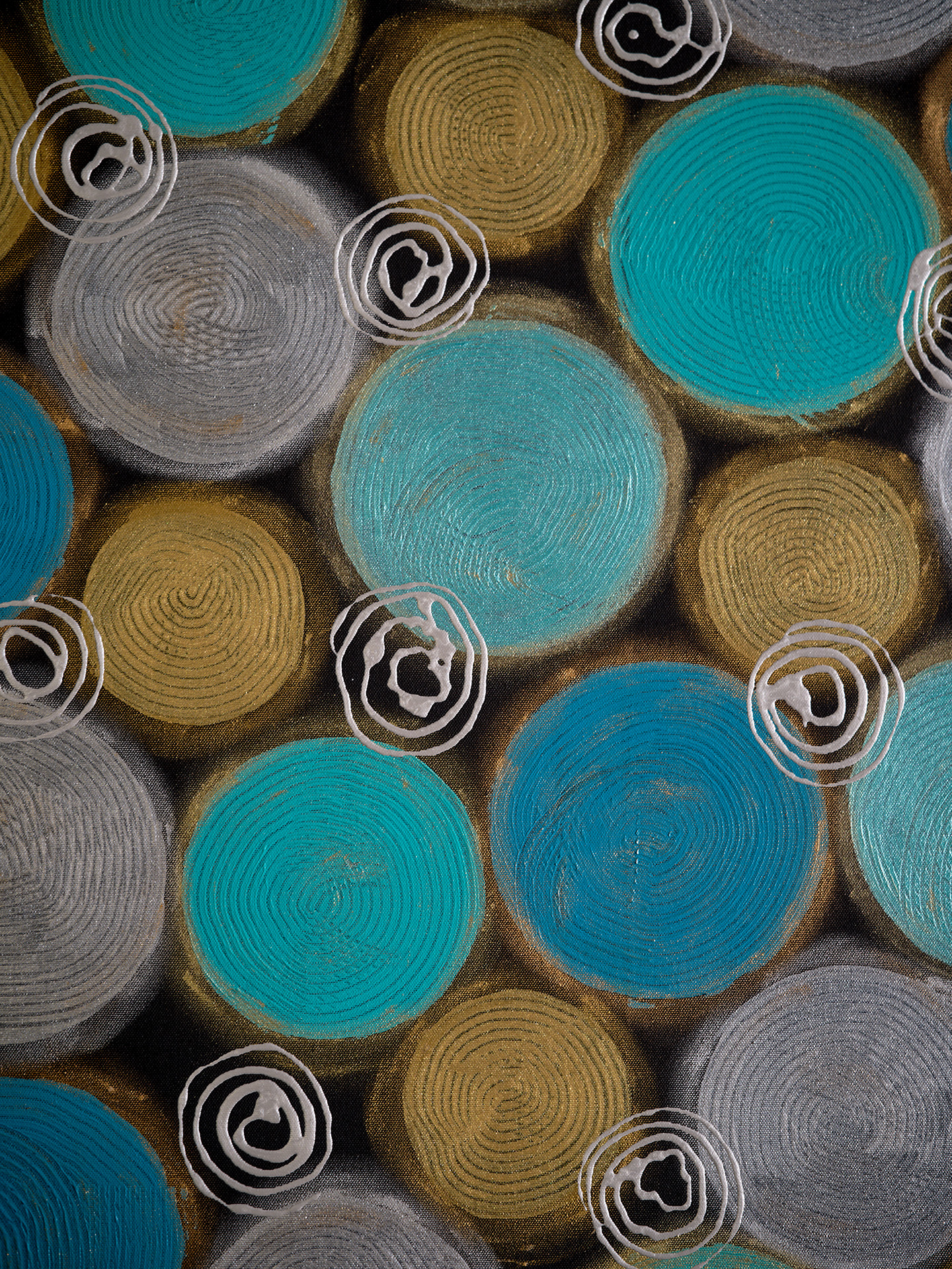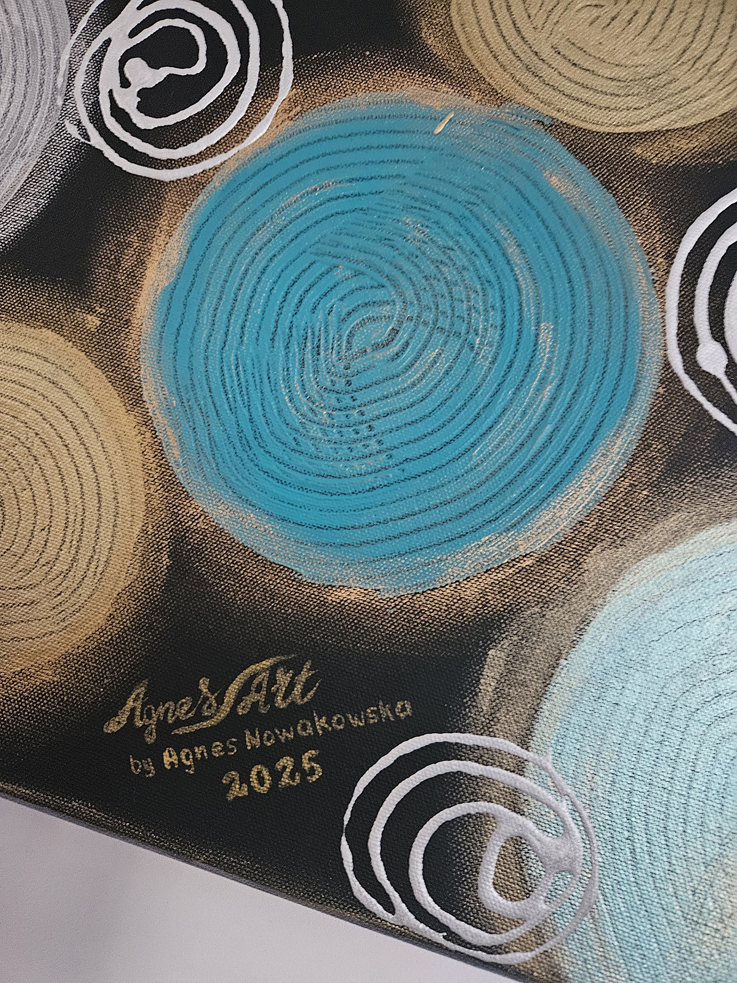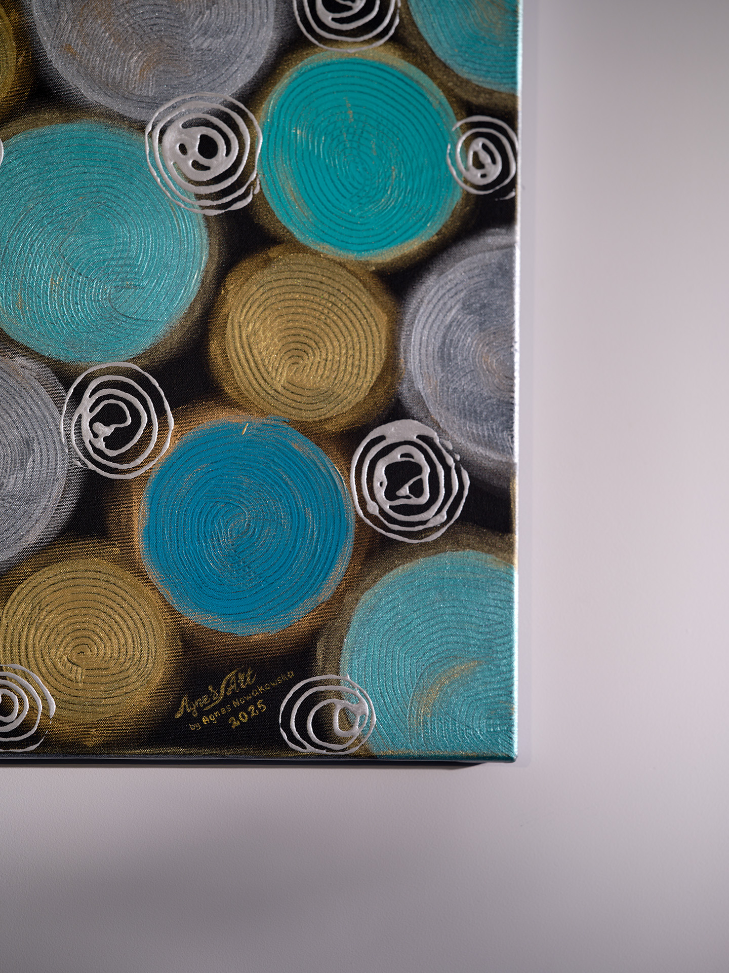 Okręgi różnej wielkości w kolorze jasnego i ciemnego turkusu oraz złota i srebra, namalowane na czarnym matowym tle. Pomiędzy dużymi okręgami znajdują się mniejsze srebrne sprężynki, a całość jest podkreślona pozłotniczą pastą w kolorze srebra i złota.
