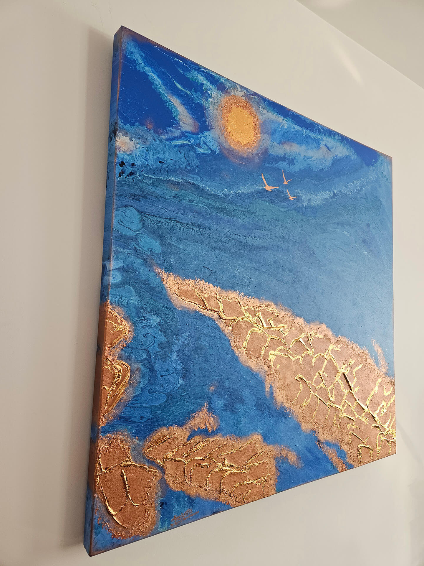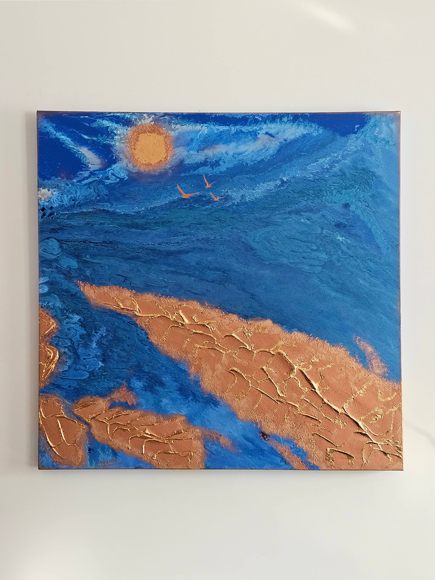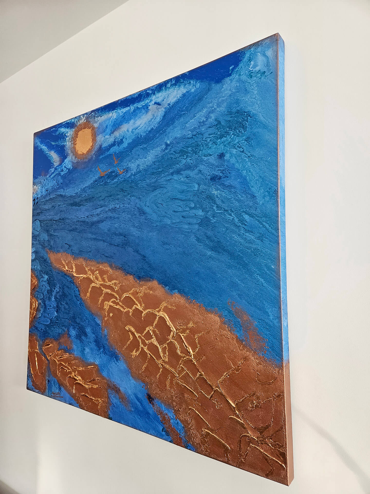 Obraz wykonany farbami akrylowymi w ciepłych kolorach miedzi na tle niebieskiego oraz błękitu, na którego tle pięknie połyskują wyklejane szlagmetalem elementy 3D. Obraz wprowadzi do pomieszczenia wyjątkową atmosferę poprzez błękit nieba, słońce, ptaki oraz podkreślony szlagmetalem element ziemi.