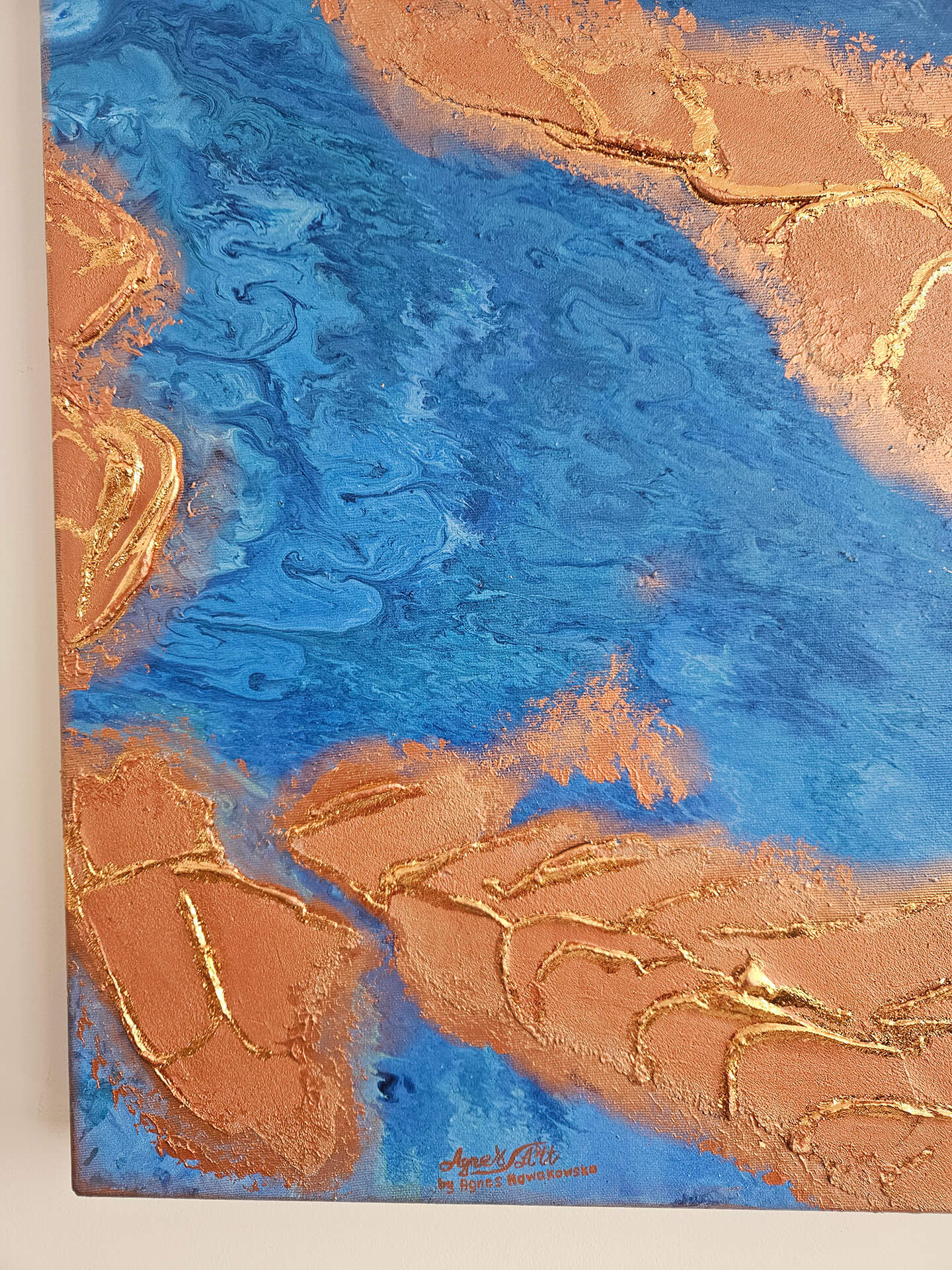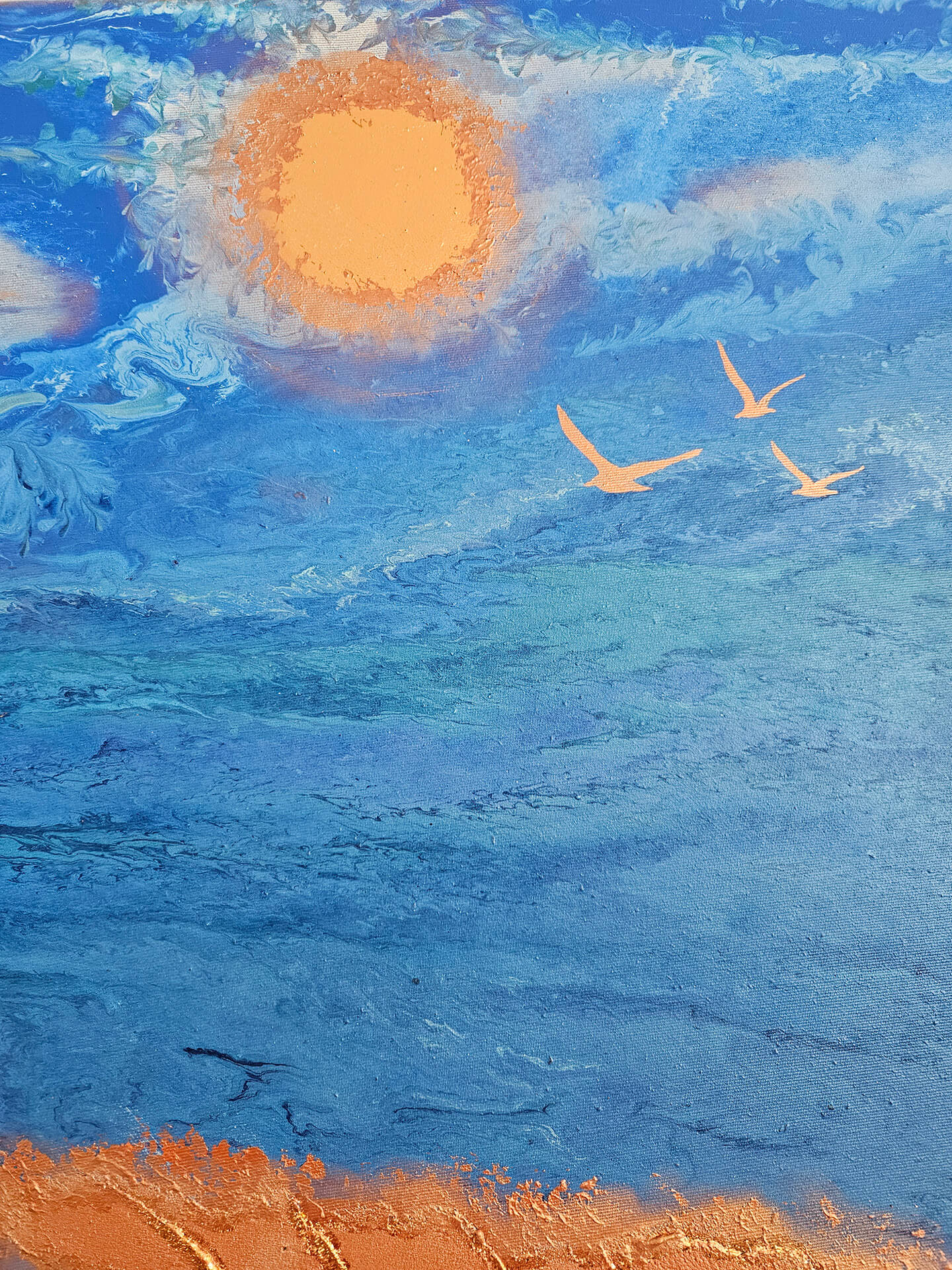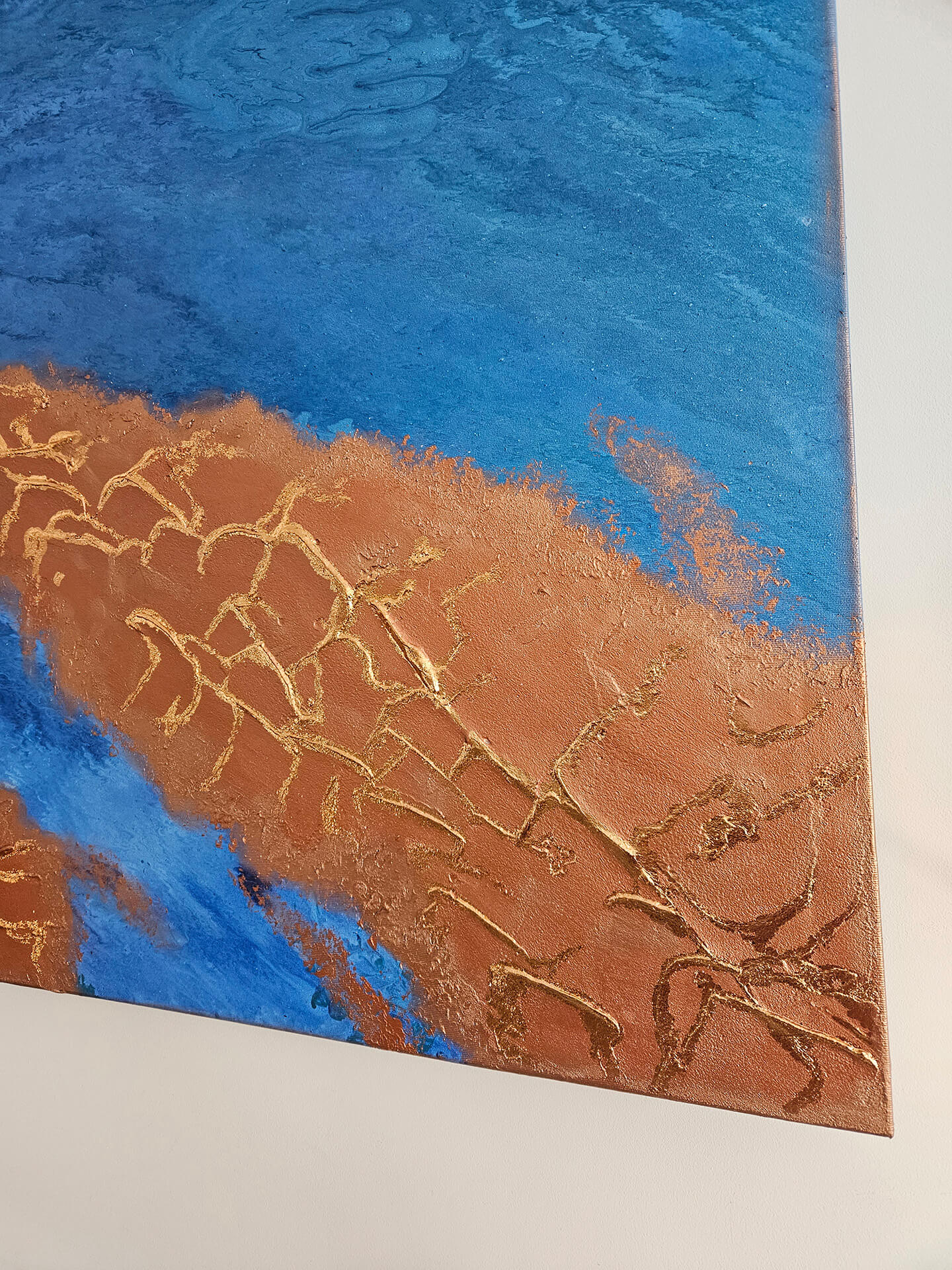 Obraz wykonany farbami akrylowymi w ciepłych kolorach miedzi na tle niebieskiego oraz błękitu, na którego tle pięknie połyskują wyklejane szlagmetalem elementy 3D. Obraz wprowadzi do pomieszczenia wyjątkową atmosferę poprzez błękit nieba, słońce, ptaki oraz podkreślony szlagmetalem element ziemi.