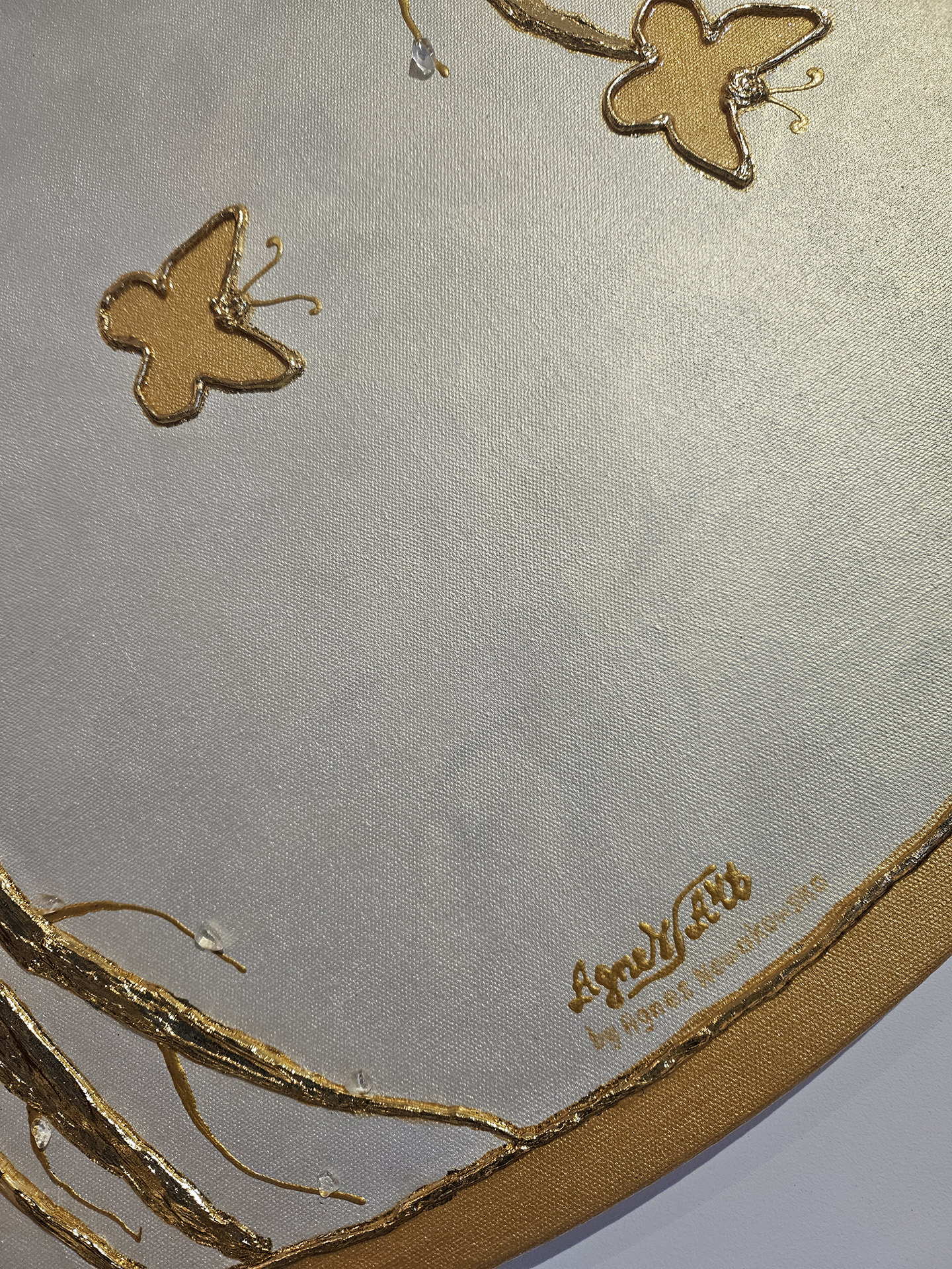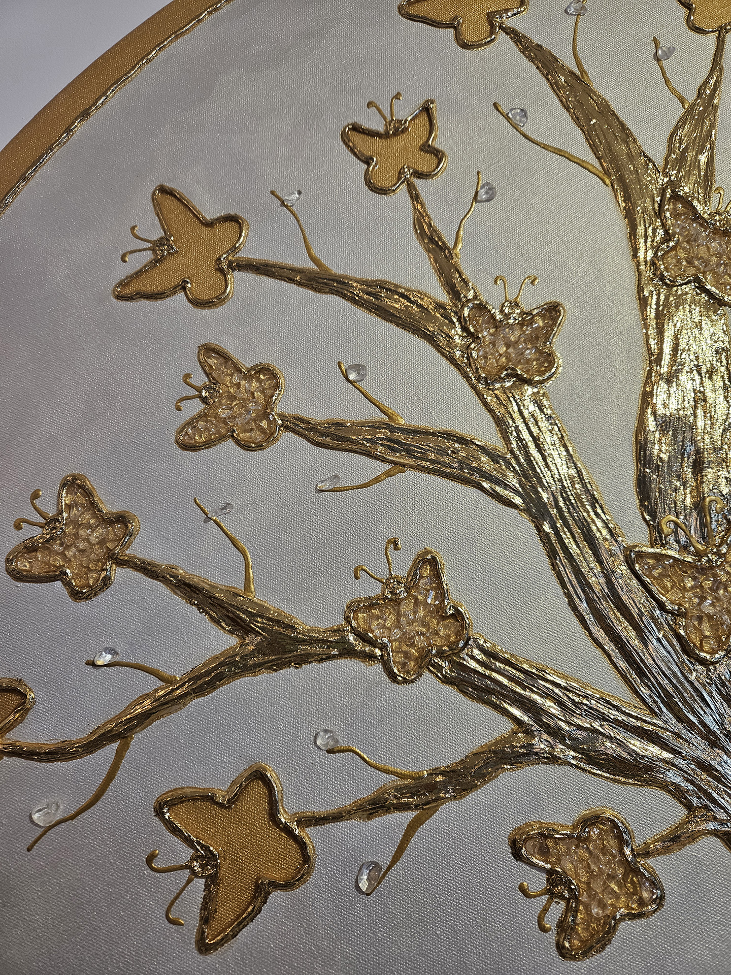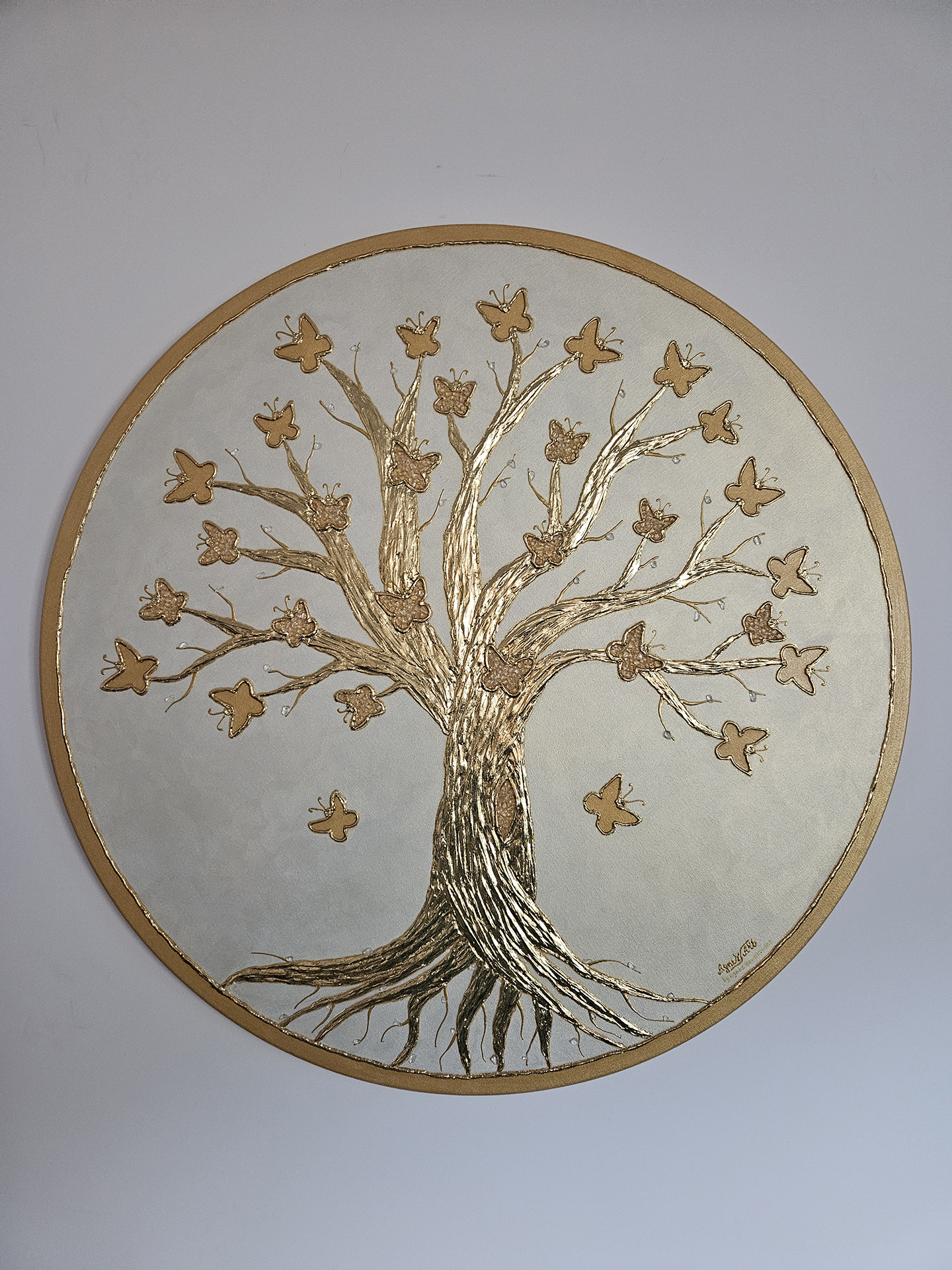 Okrągły obraz 3D, średnica 100cm, ręcznie malowany farbami akrylowymi, przedstawia „Drzewo Życia” z motylami w złocie na perłowym białym tle. Część motyli wyklejona kryształem górskim, najsilniej oczyszczającym i energetyzującym kamieniem szlachetnym. Całość pokryta szlagmetalem w kolorze złota. Unikalny dekor – sprawdź szczegóły i zamów!