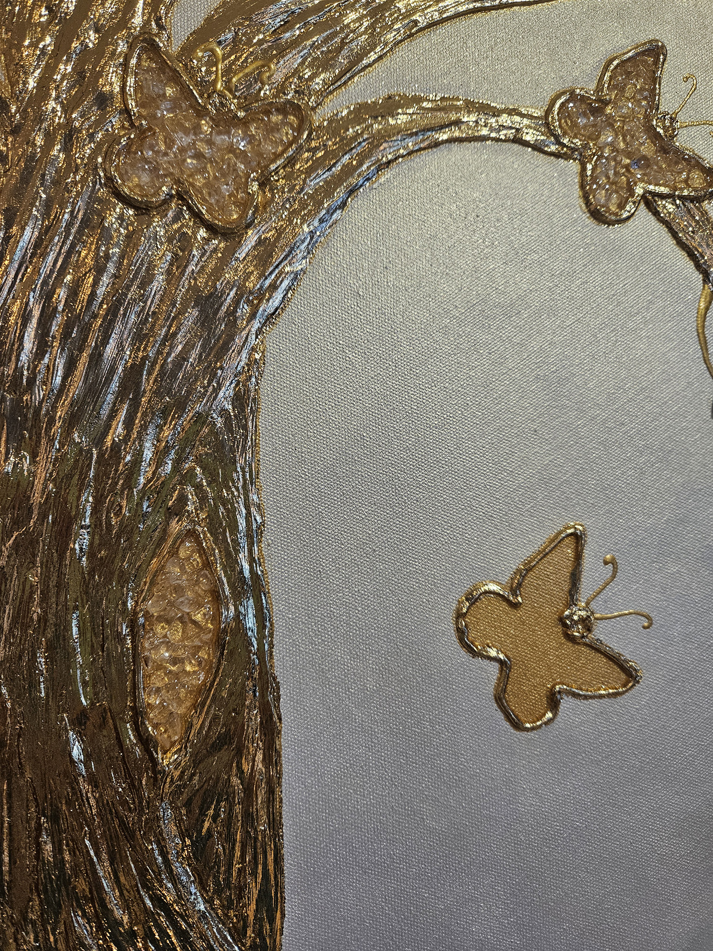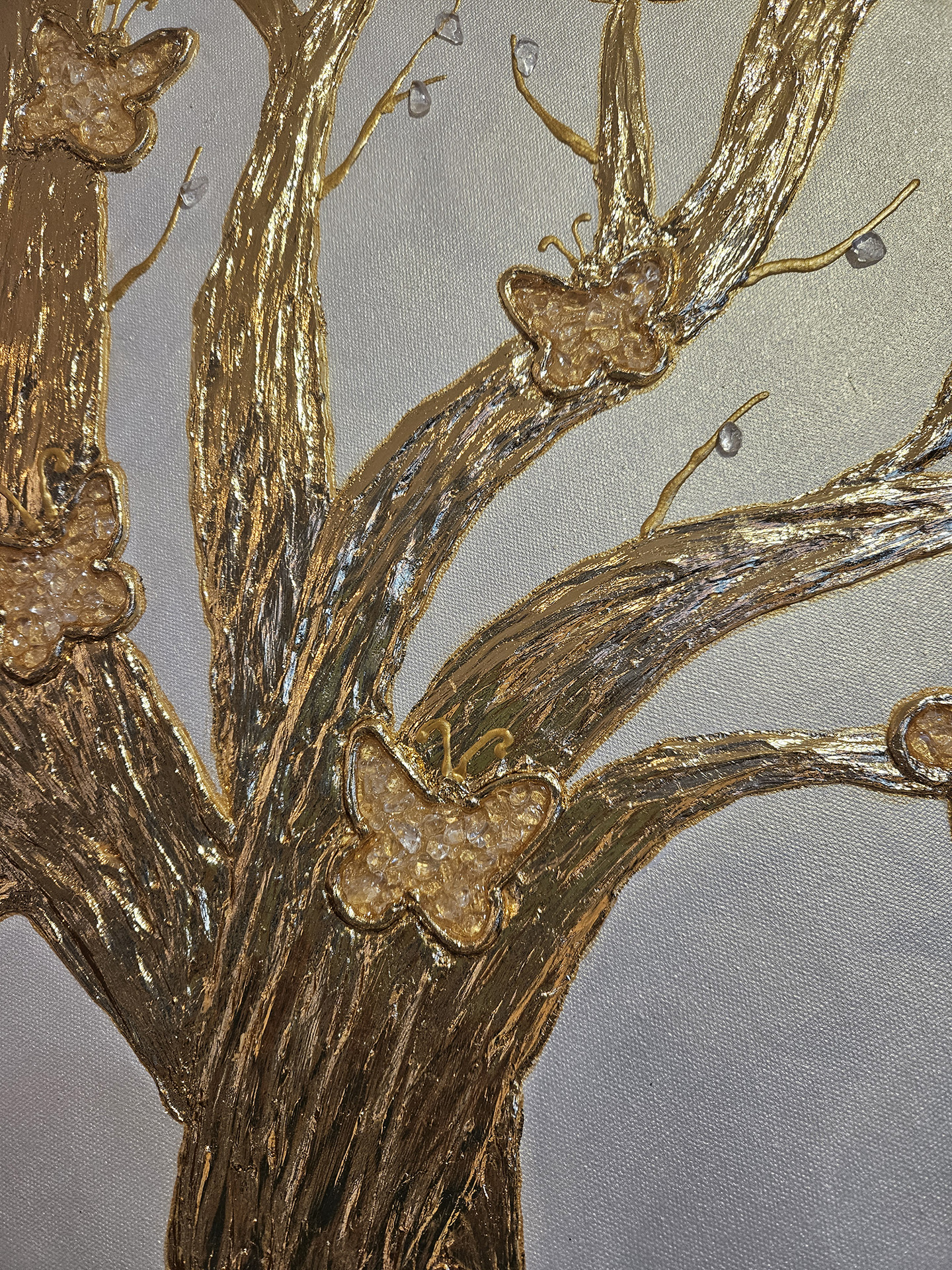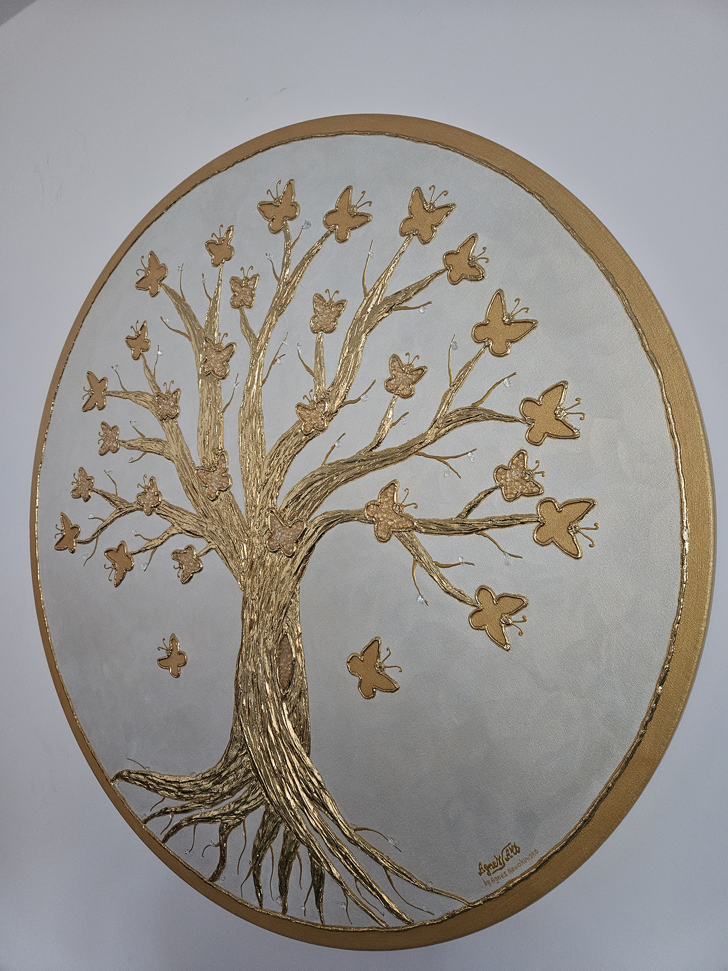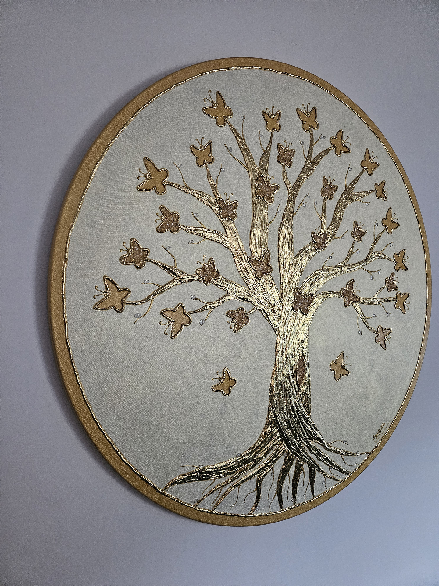 Obraz wykonany akrylami oraz pastą strukturalną, przedstawia drzewo z korzeniami i rozłożystą koroną, w której pięknie połyskują motyle jako symbol m.in. przemiany. Część motyli wyklejona kryształem górskim, najsilniej oczyszczającym kamieniem szlachetnym. Całość pięknie połyskuje na perłowym tle w kolorze bieli. Kontury motyli oraz drzewo wraz z korzeniami wyklejone szlagmetalem w kolorze złota. Obraz mocno oczyszczający i energetyzujący obecną przestrzeń, a w duchowym aspekcie również symbolicznie przyszłość i kolejne pokolenia.