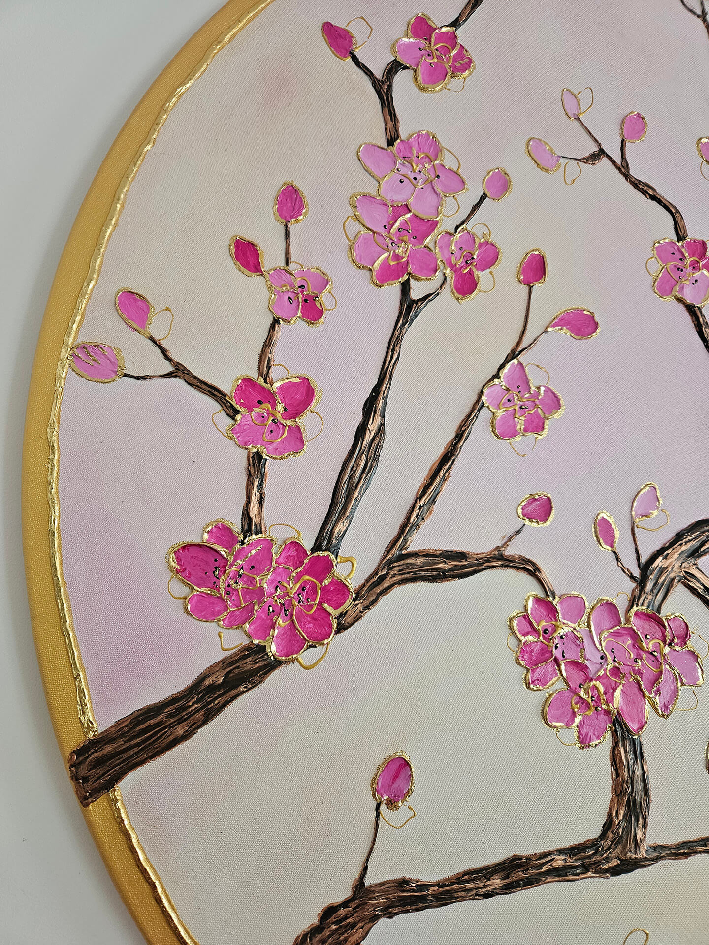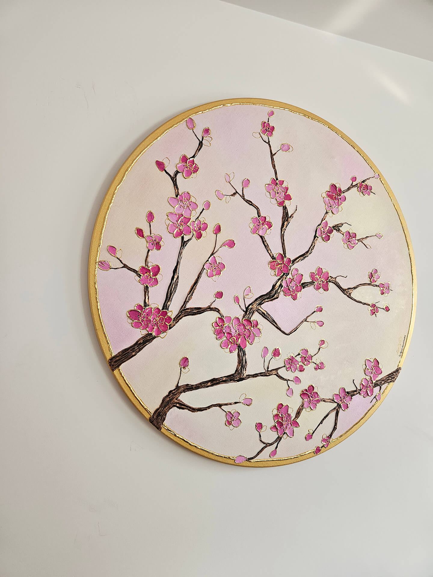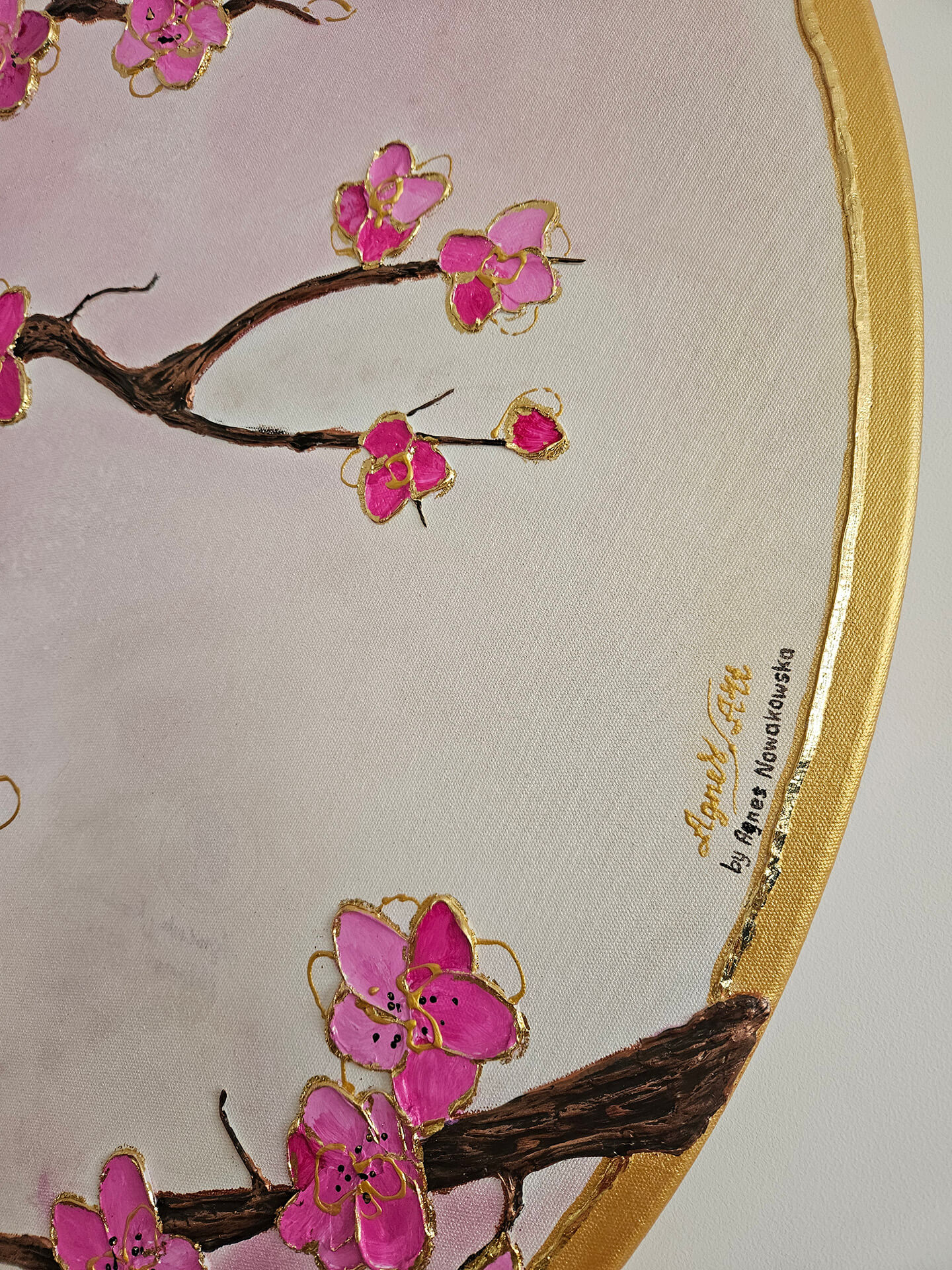 Ten obraz to trójwymiarowa opowieść o subtelności i luksusie. Ręcznie formowane, wypukłe płatki wiśni z pasty strukturalnej nadają kompozycji głębię, którą chce się poczuć pod palcami. Połączenie pudrowego różu z perłowym tłem wnosi do wnętrza spokój, a wykończenie płatków i gałęzi prawdziwym szlagmetalem sprawia, że obraz „żyje” wraz ze zmieniającym się światłem. To zamknięta w okrągłej formie harmonia, która łączy surową strukturę z biżuteryjnym blaskiem złota.