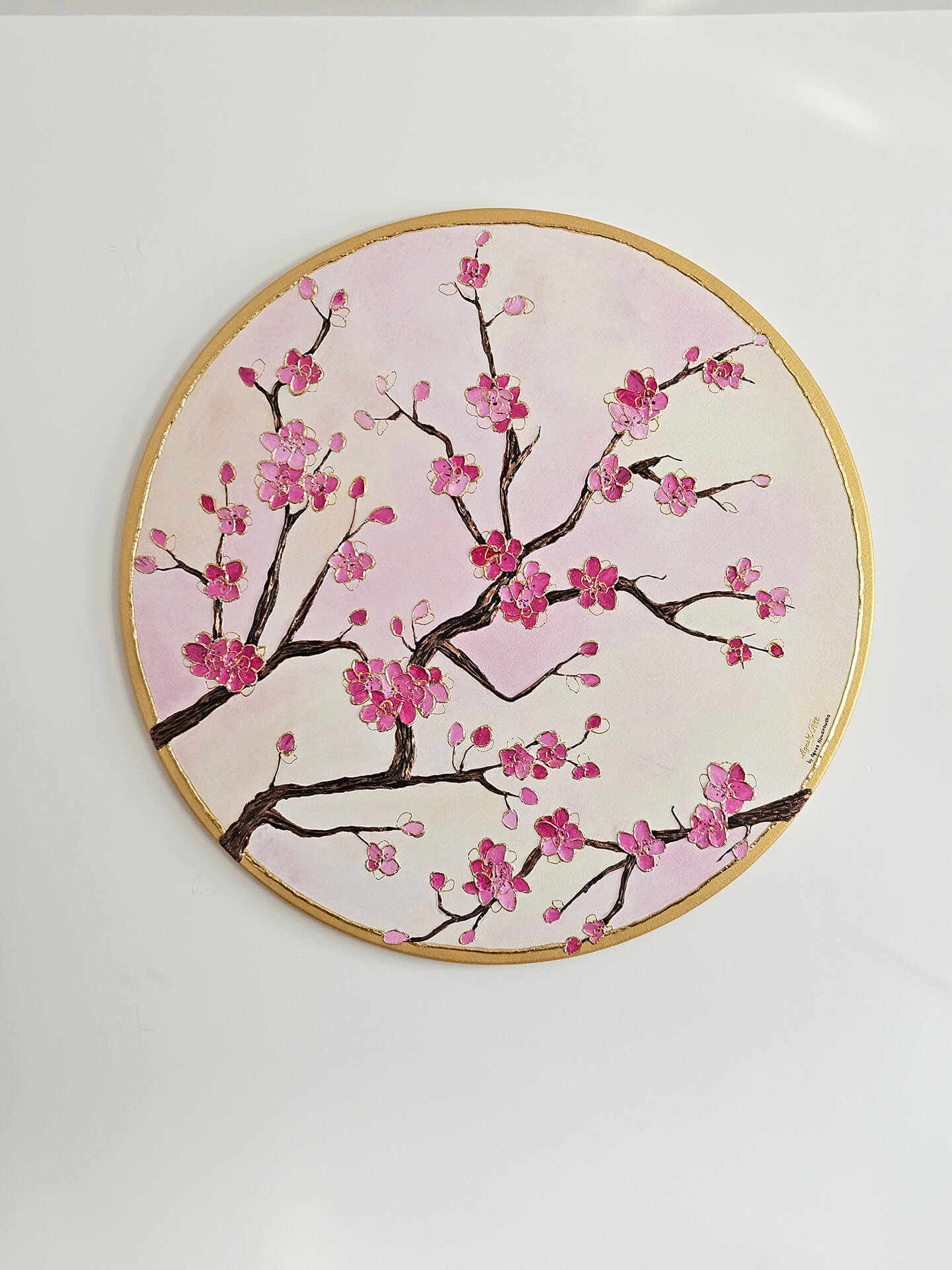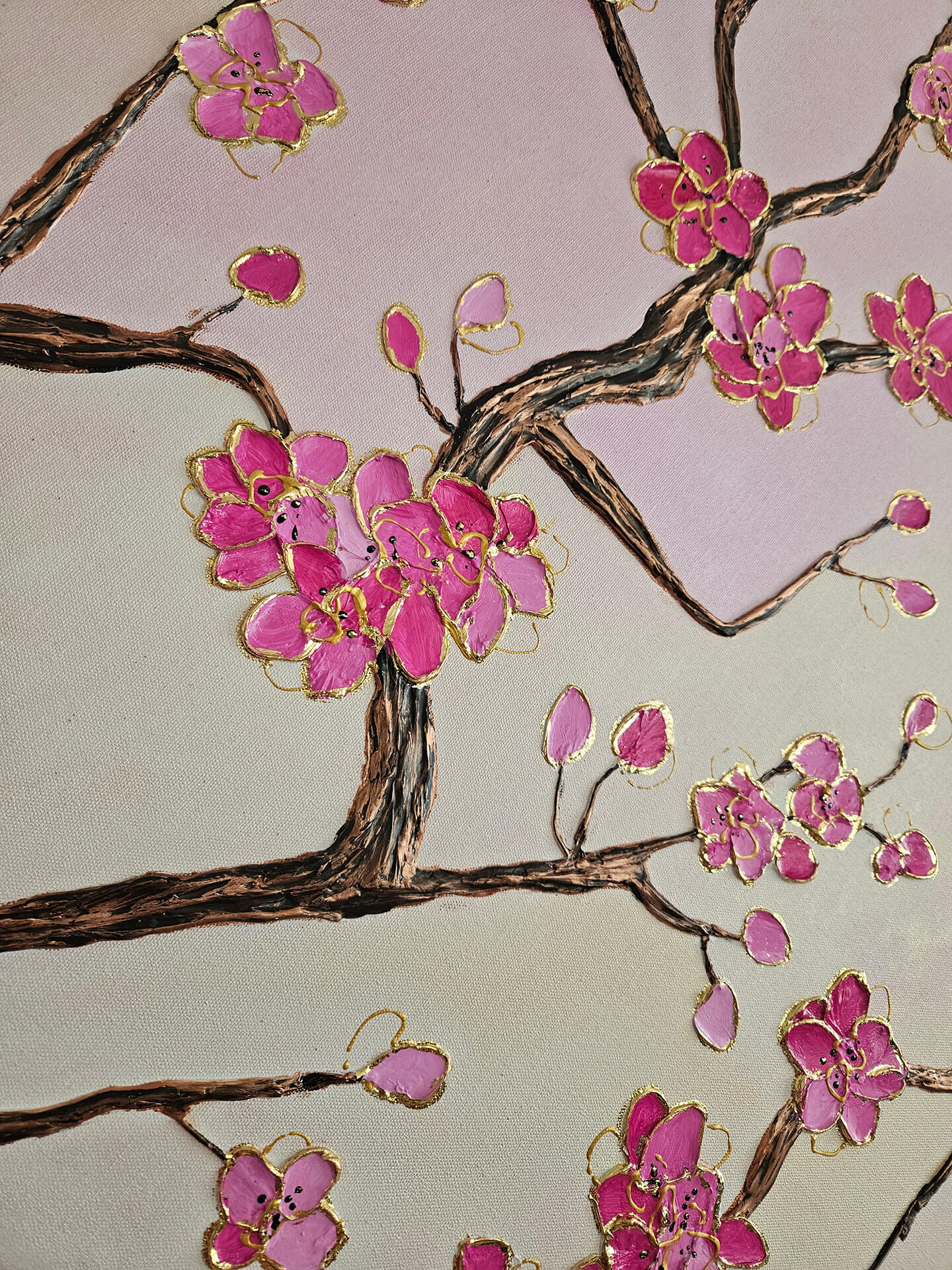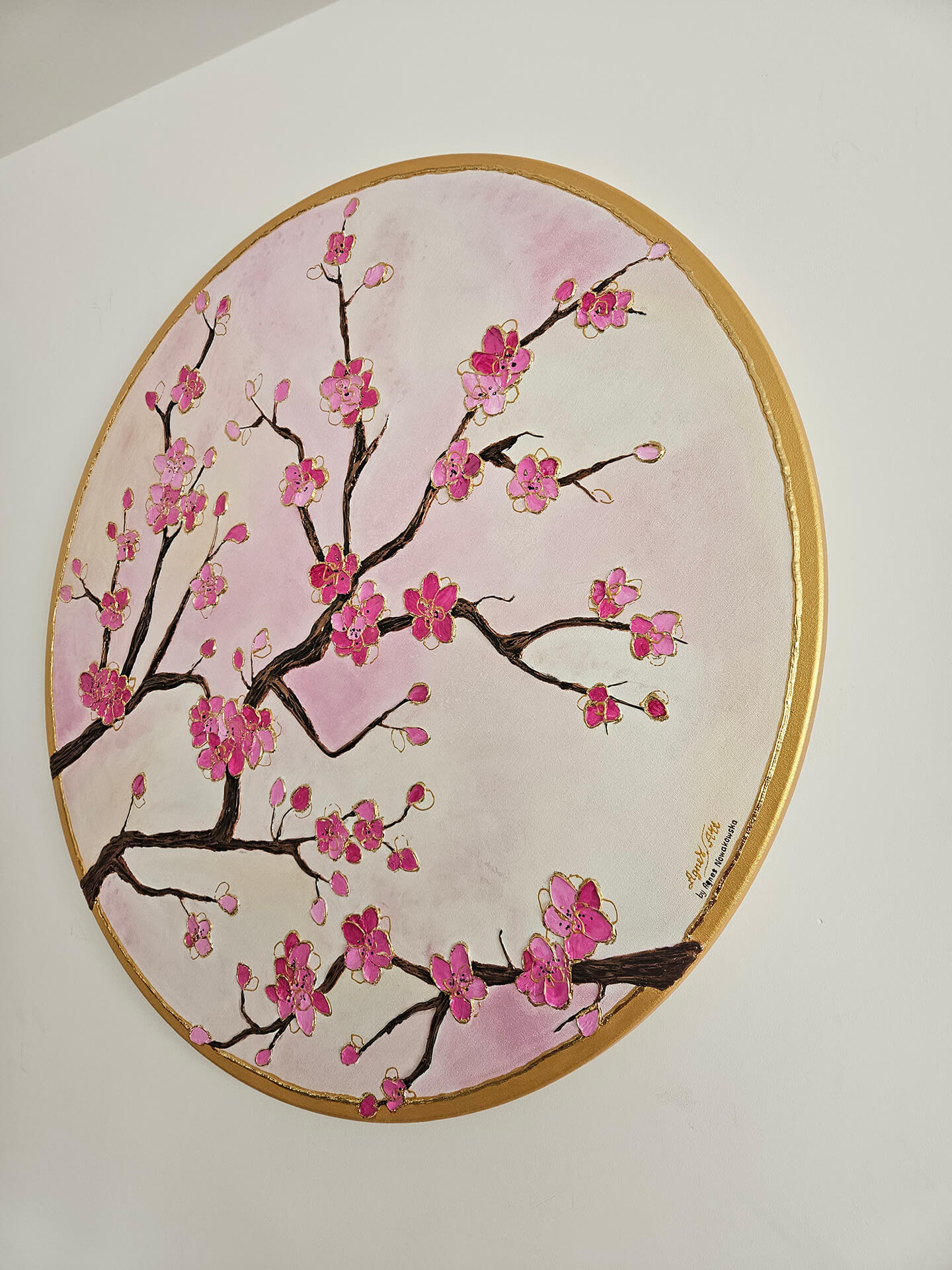 Ten obraz to trójwymiarowa opowieść o subtelności i luksusie. Ręcznie formowane, wypukłe płatki wiśni z pasty strukturalnej nadają kompozycji głębię, którą chce się poczuć pod palcami. Połączenie pudrowego różu z perłowym tłem wnosi do wnętrza spokój, a wykończenie płatków i gałęzi prawdziwym szlagmetalem sprawia, że obraz „żyje” wraz ze zmieniającym się światłem. To zamknięta w okrągłej formie harmonia, która łączy surową strukturę z biżuteryjnym blaskiem złota.