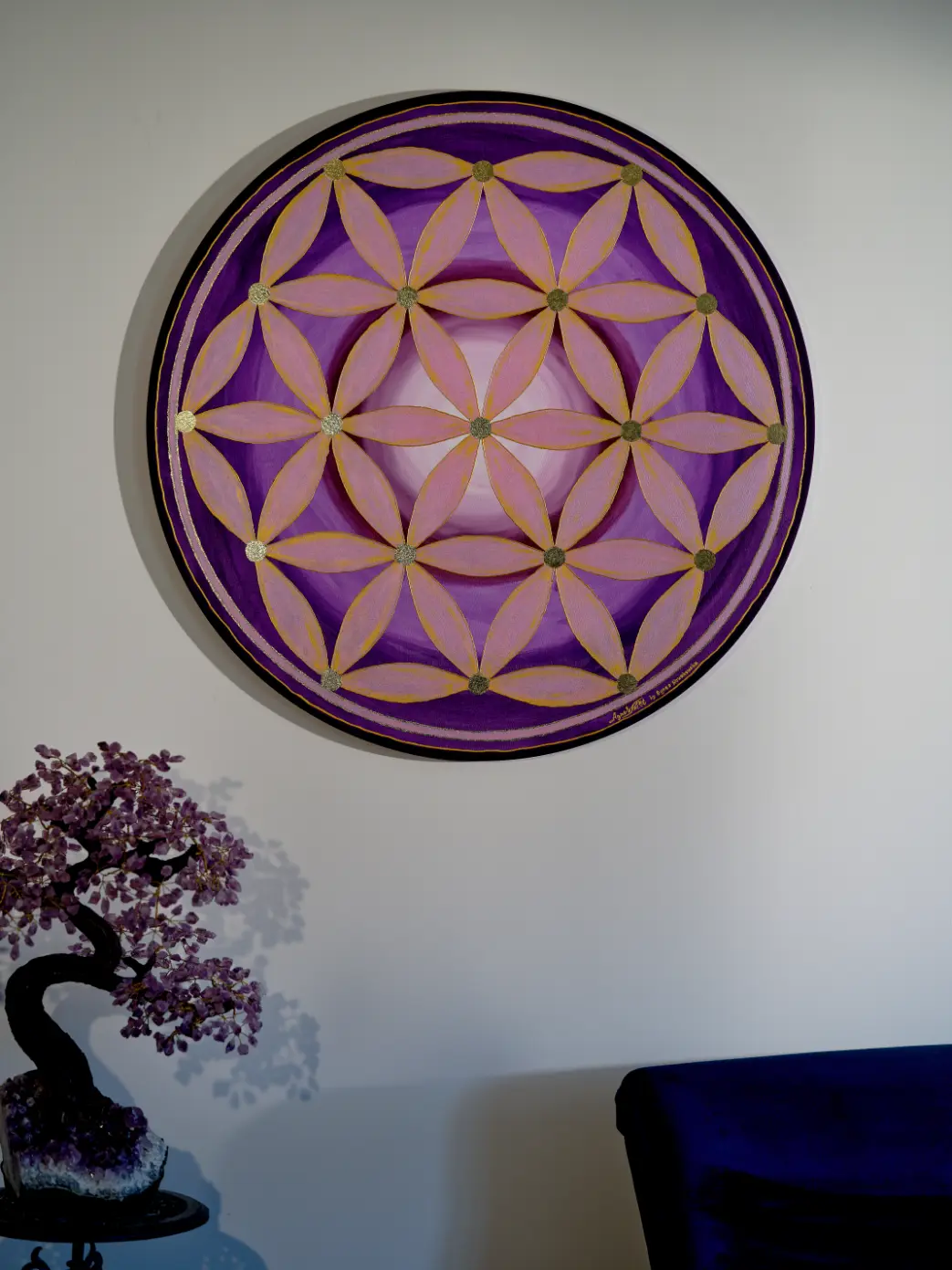 Obraz mandala o średnicy 100cm, ręcznie malowana metalicznymi farbami akrylowymi, przedstawiająca na cieniowanym fioletowym tle ”Kwiat Życia” w metalicznym różu, wyklejany płatkami szlagmetalu w kolorze złota.