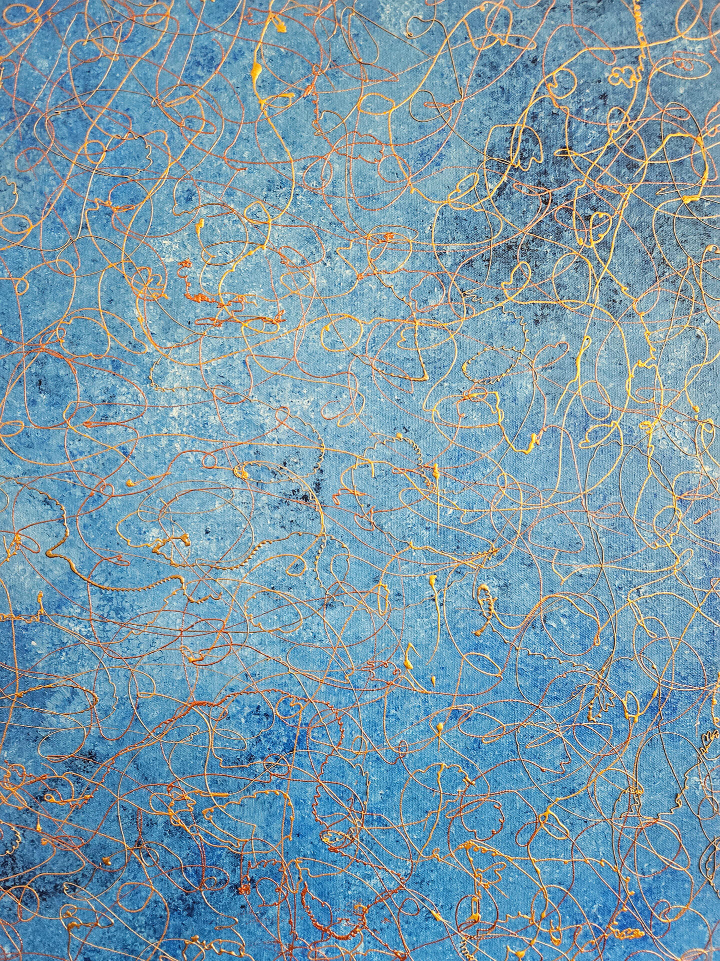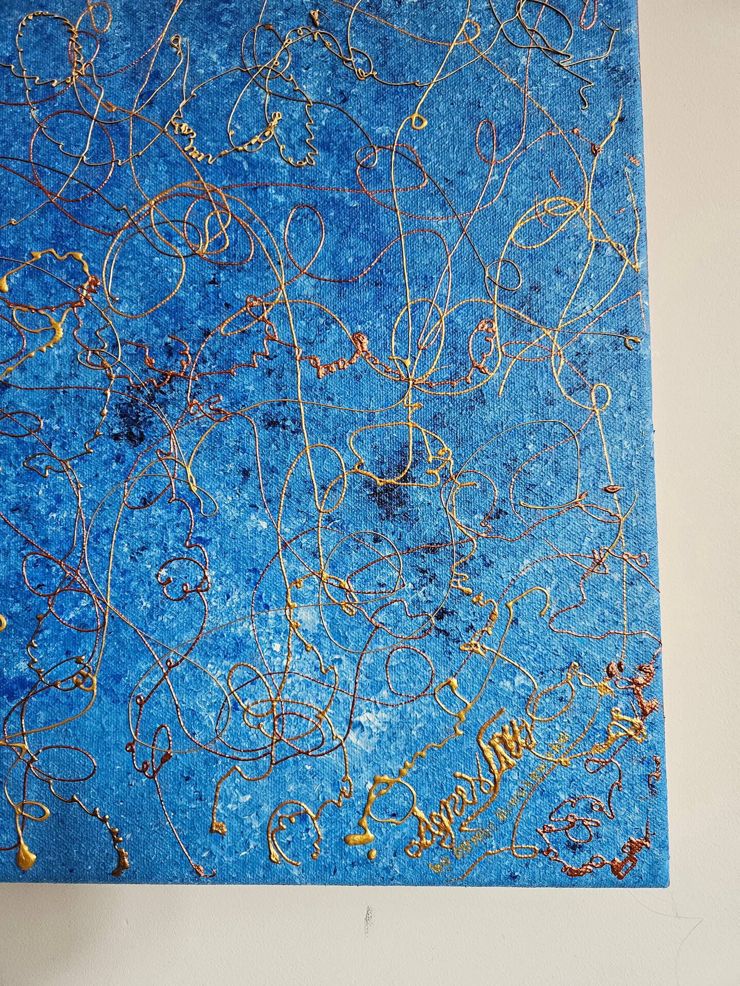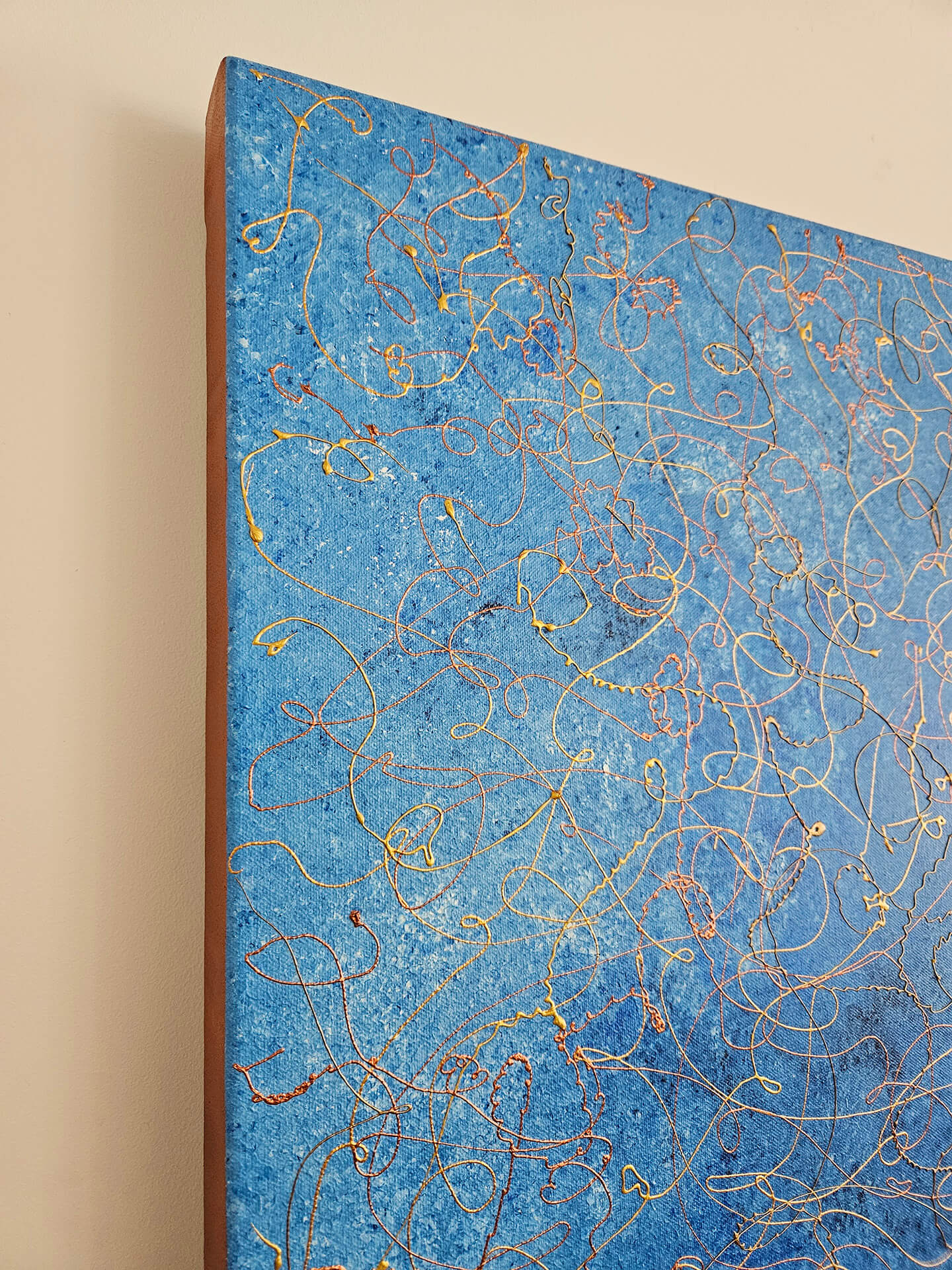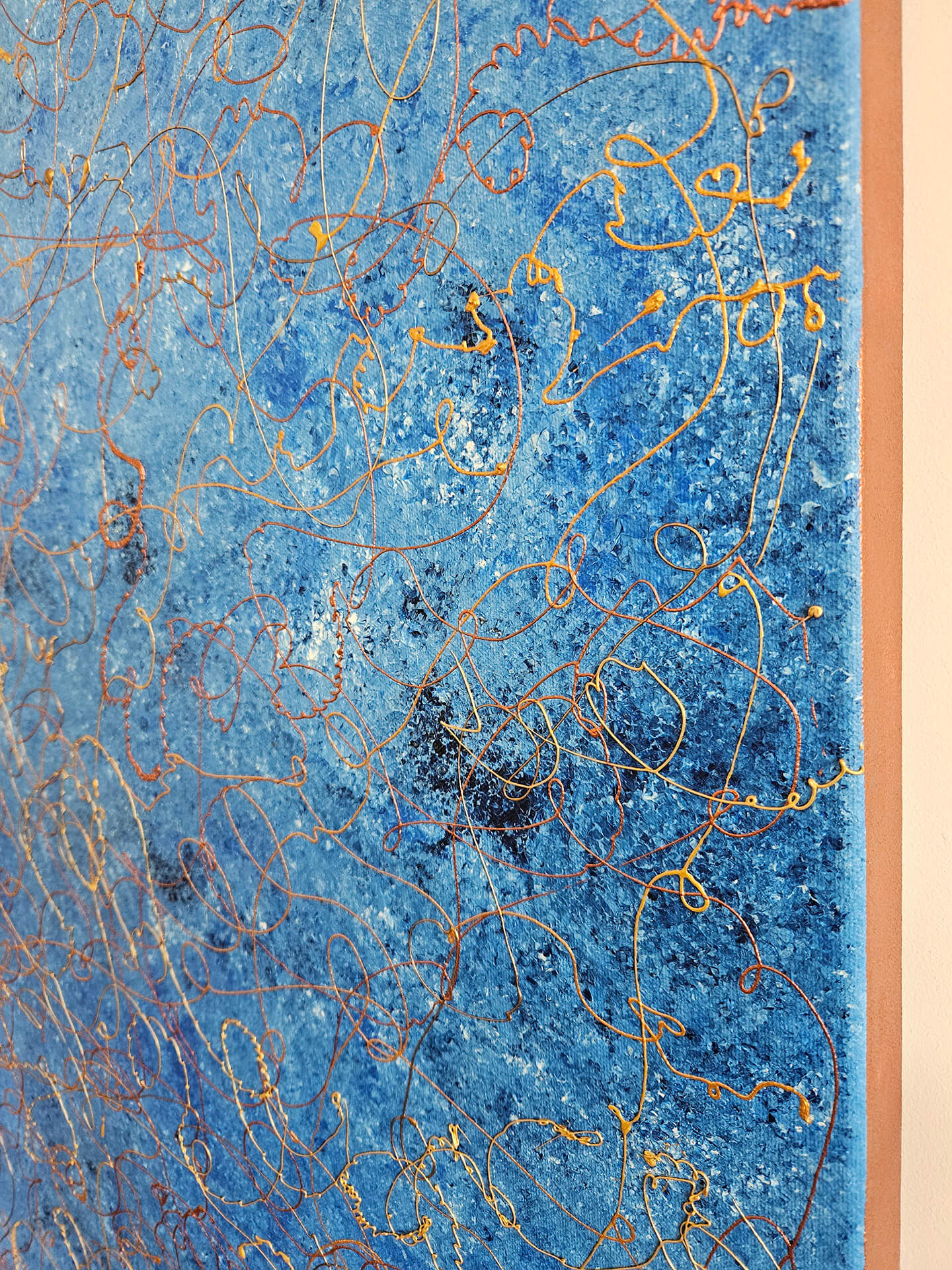 Obraz wykonany metalicznymi farbami akrylowymi w kolorach błękitu, bieli i odrobiny granatu. Delikatne strukturalne nici w kolorach złota i miedzi niczym drogowskazy łączą energię ziemi z duchowością nieba. Miedź wnosi domowe ciepło i stabilność, a złoto – blask sukcesu i wewnętrznej mocy. Abstrakcja wprowadzi spokój, poczucie relaksu i wolności do pomieszczenia.