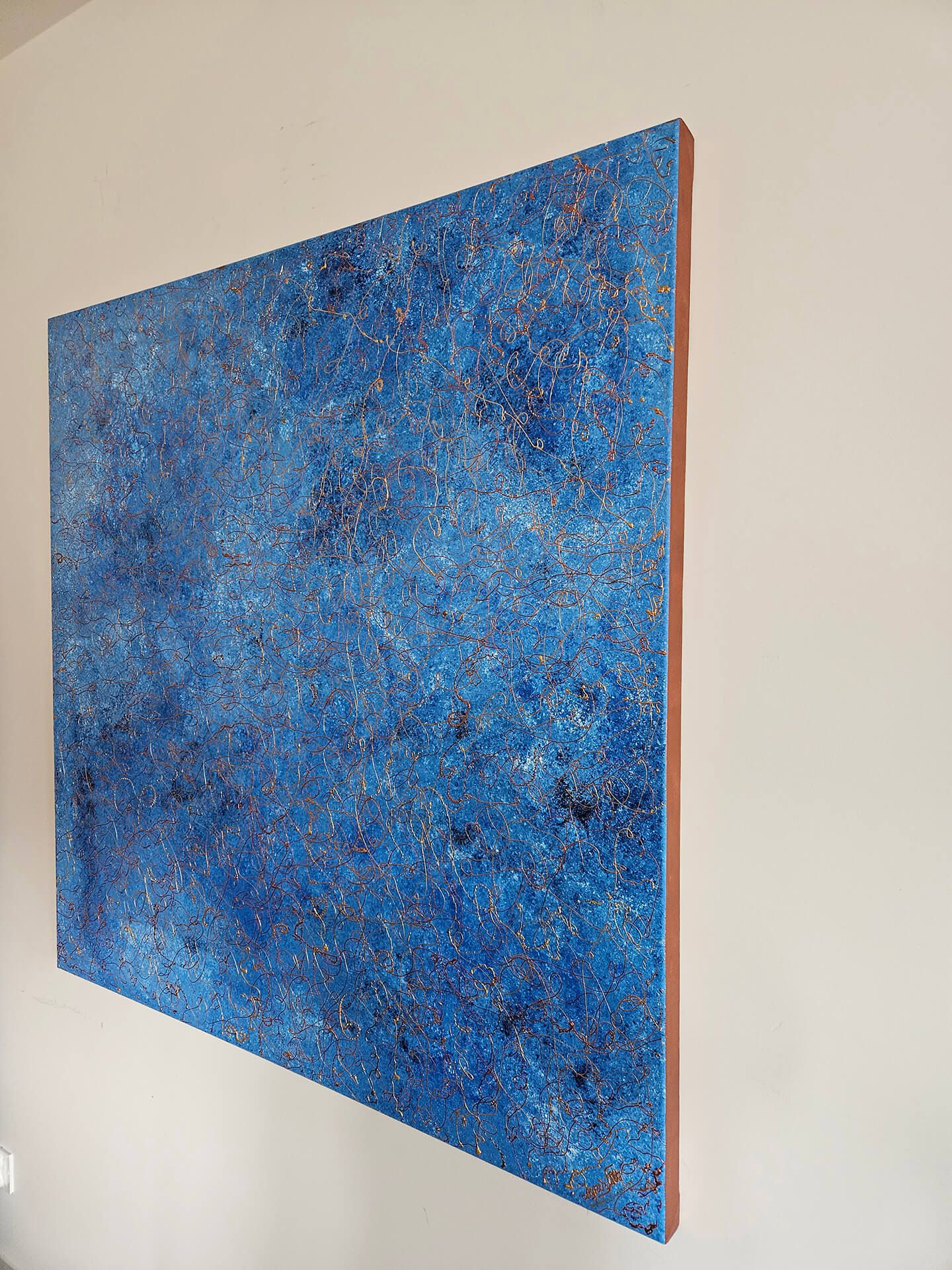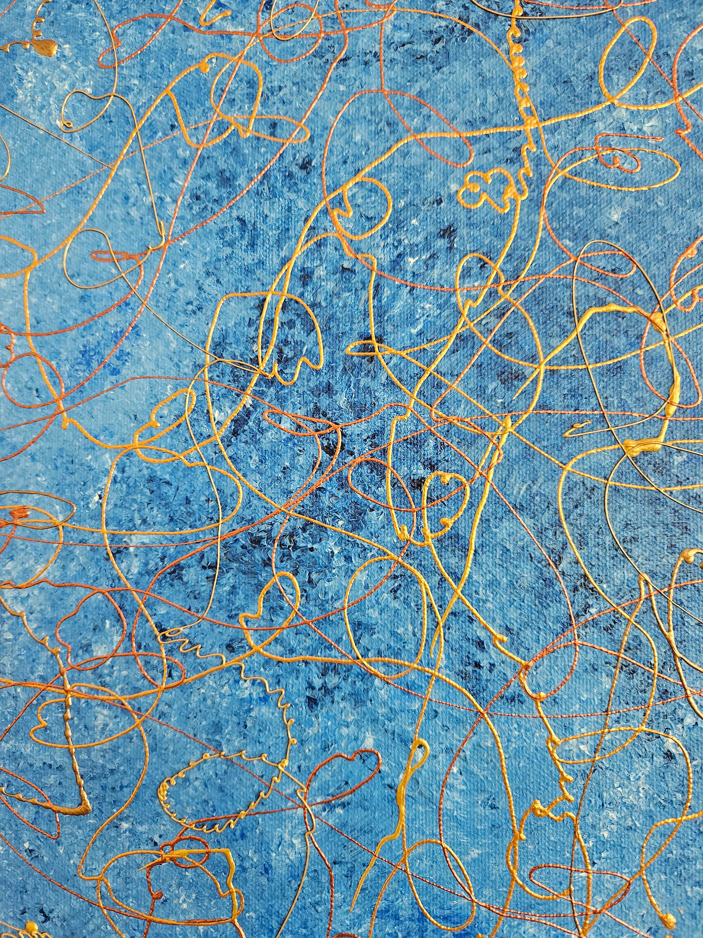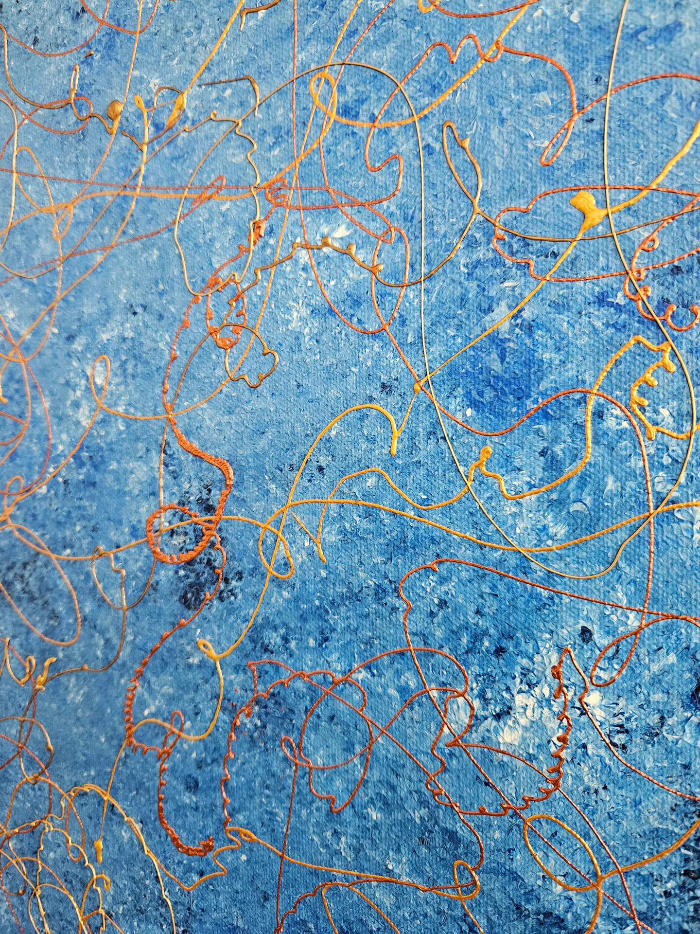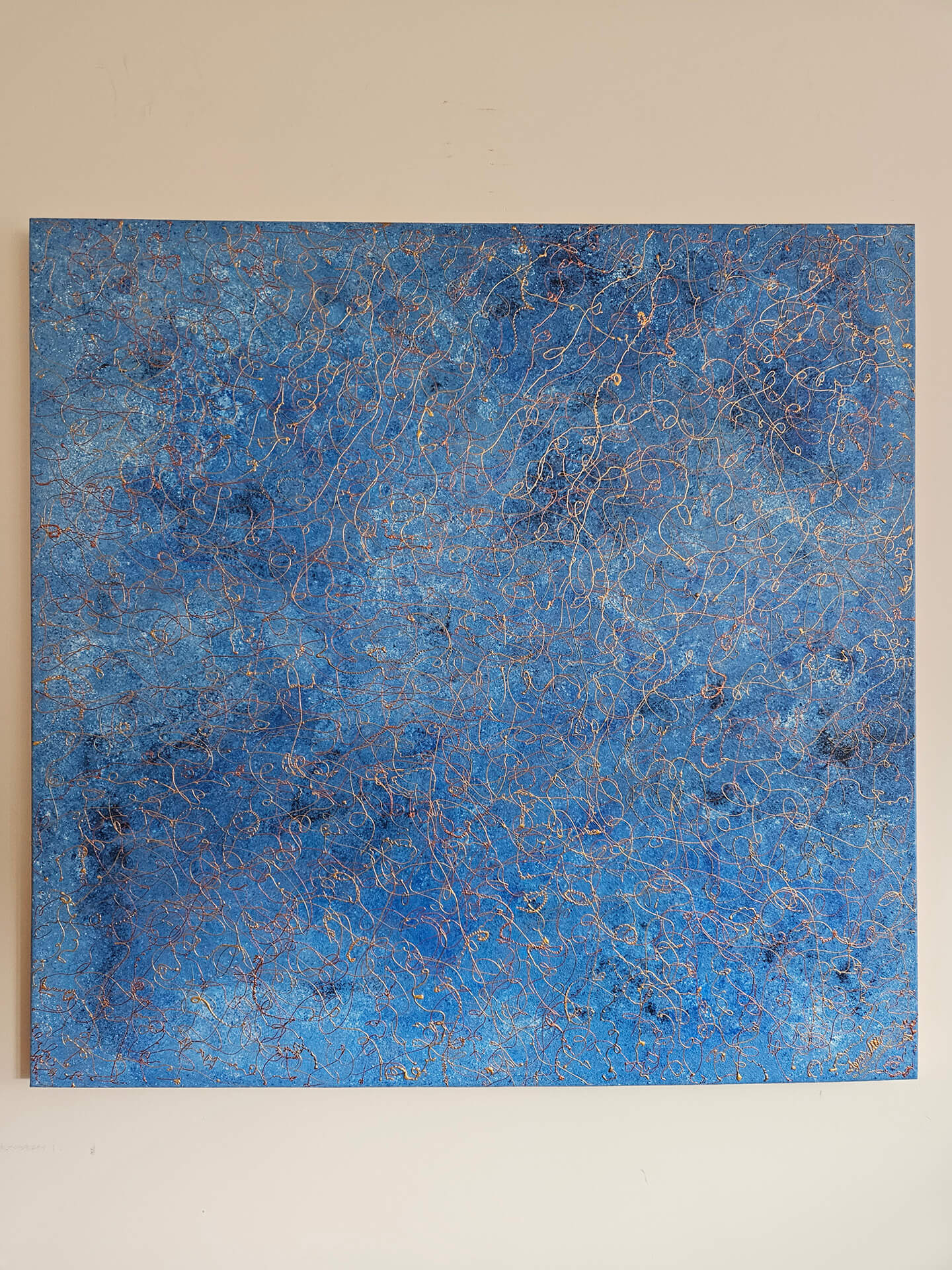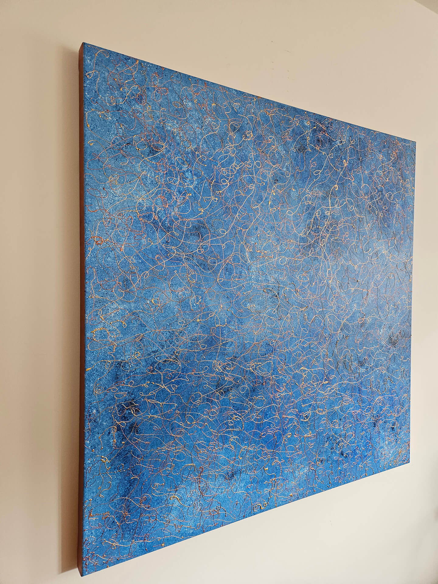 Obraz wykonany metalicznymi farbami akrylowymi w kolorach błękitu, bieli i odrobiny granatu. Delikatne strukturalne nici w kolorach złota i miedzi niczym drogowskazy łączą energię ziemi z duchowością nieba. Miedź wnosi domowe ciepło i stabilność, a złoto – blask sukcesu i wewnętrznej mocy. Abstrakcja wprowadzi spokój, poczucie relaksu i wolności do pomieszczenia.
