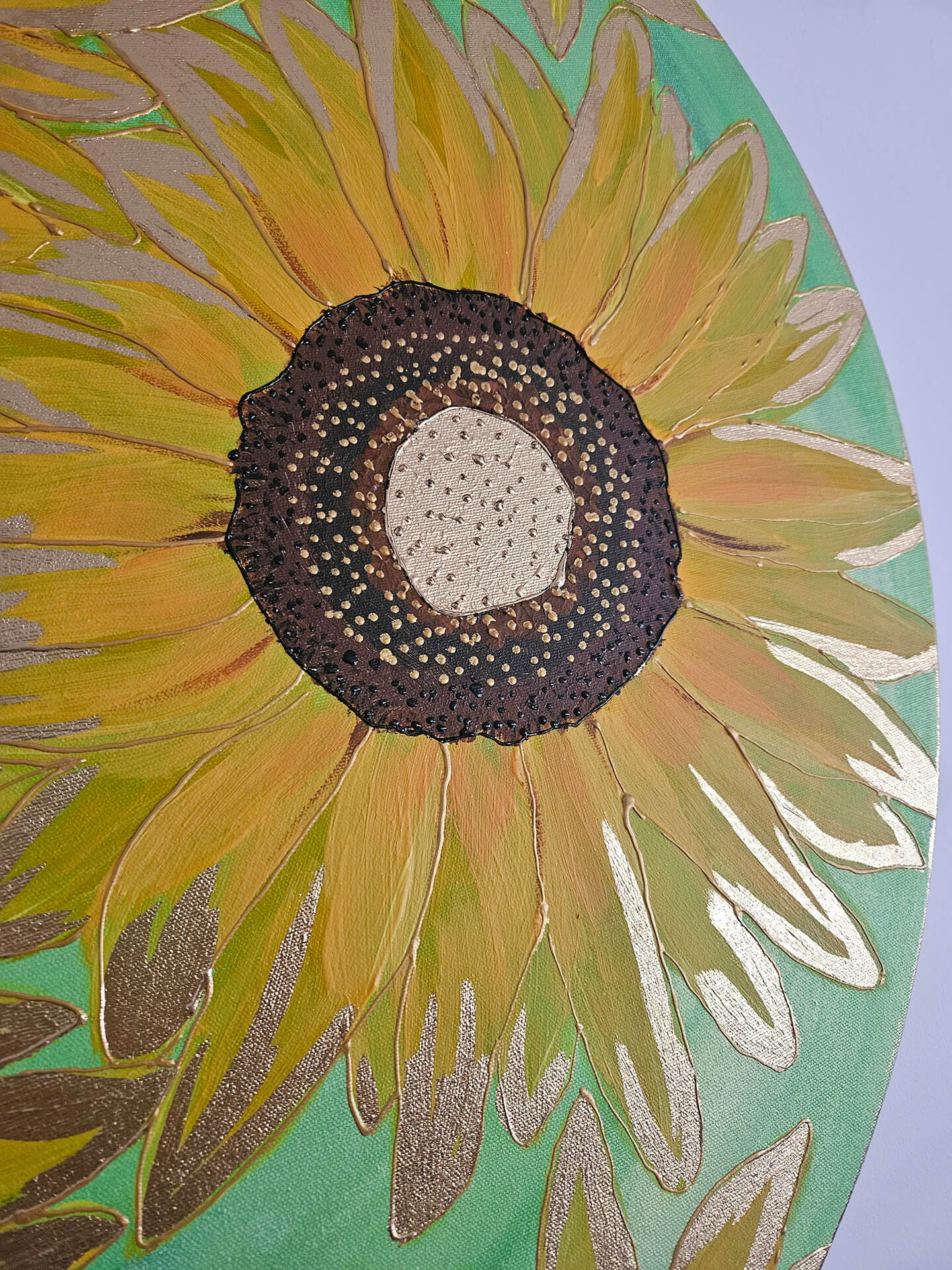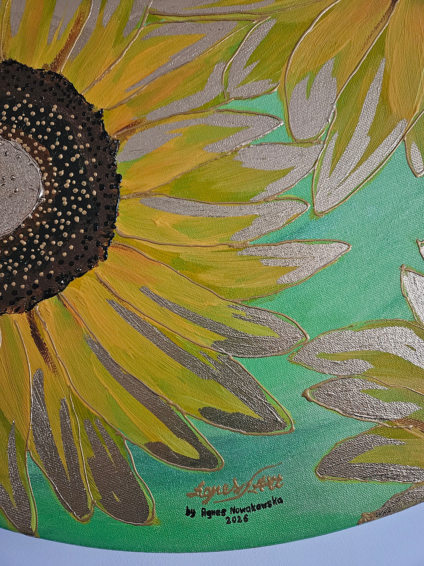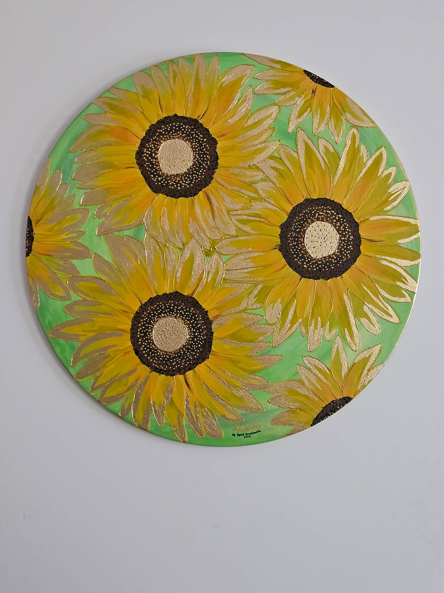 Żółte płatki słonecznika pokryte farbą w odcieniach żółci, kontury podkreślone złotą metaliczną farbą, pięknie komponują się na cieniowanym jasno zielonym wpadającym w seledynowy tle. Kontury płatków podkreślone dodatkowo złotym szlagmetalem, środki w brązie z odrobiną czerni i złota, wyklejane szlagmetalem w kolorze złota.