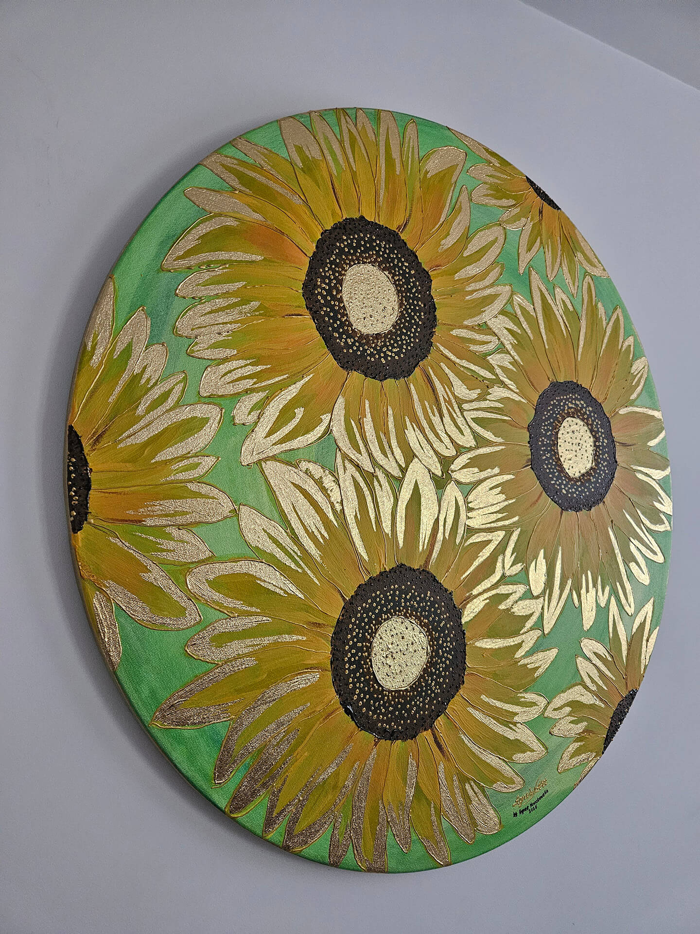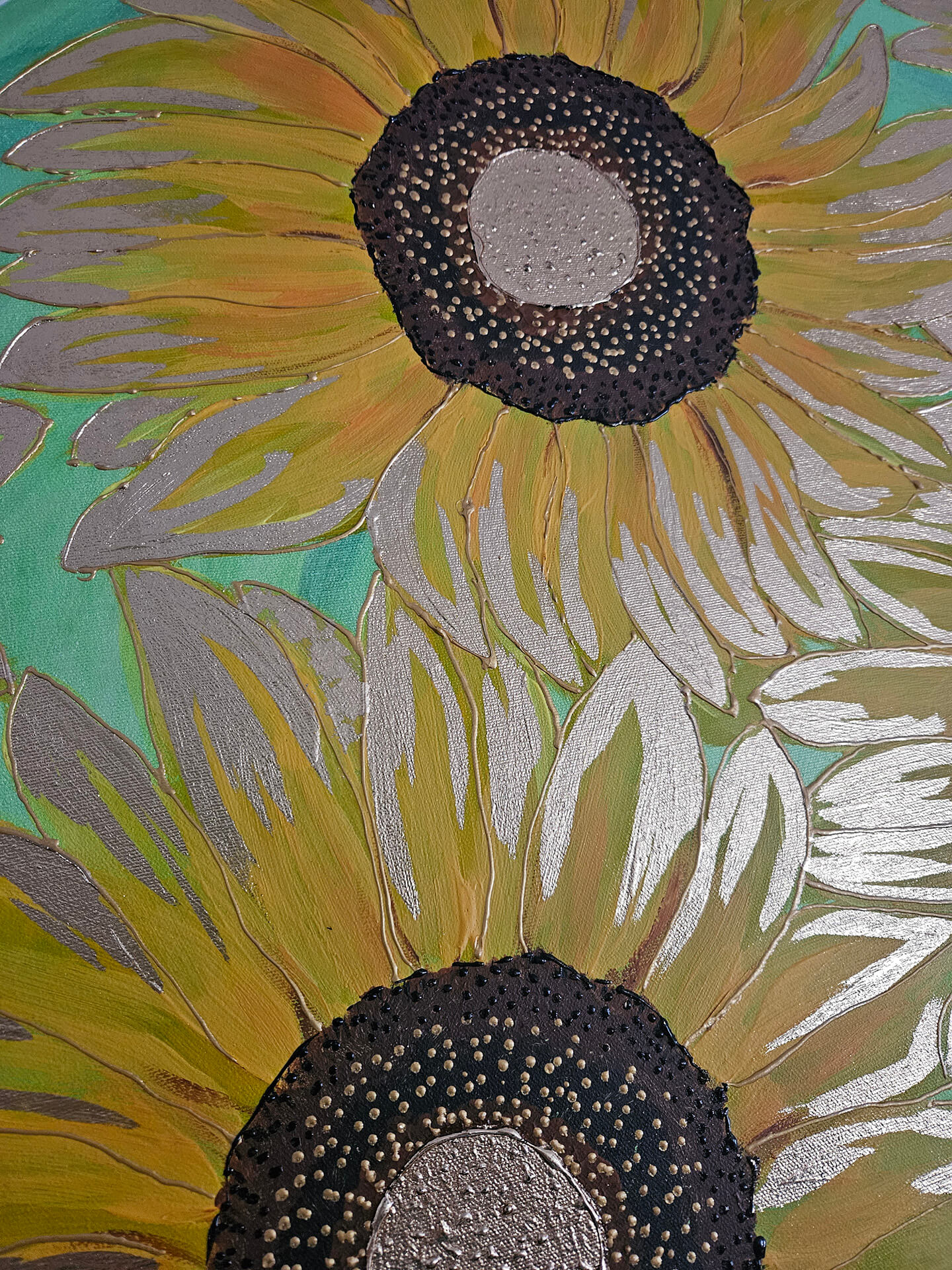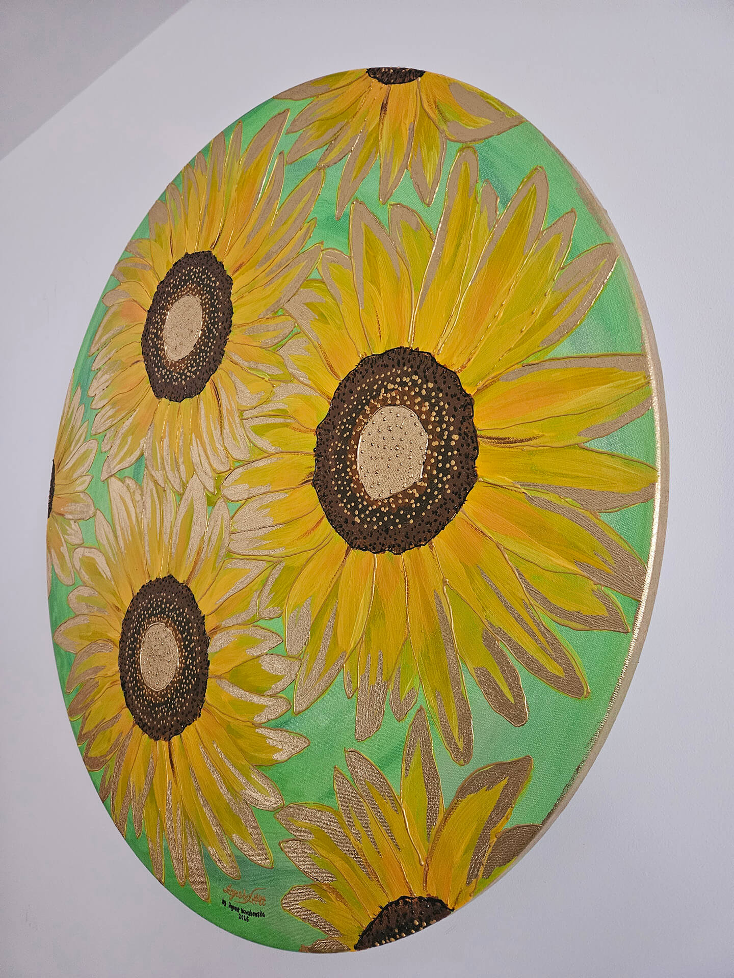 Żółte płatki słonecznika pokryte farbą w odcieniach żółci, kontury podkreślone złotą metaliczną farbą, pięknie komponują się na cieniowanym jasno zielonym wpadającym w seledynowy tle. Kontury płatków podkreślone dodatkowo złotym szlagmetalem, środki w brązie z odrobiną czerni i złota, wyklejane szlagmetalem w kolorze złota.